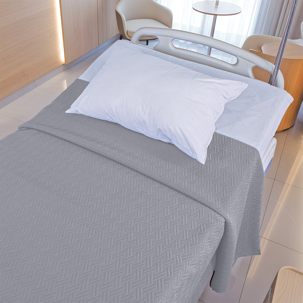 La elegancia del gris siempre será sobresaliente, preciosa colcha decorativa de gran duración, sus pacientes quedaran agradecidos por darles una estadía placentera en su recuperación.